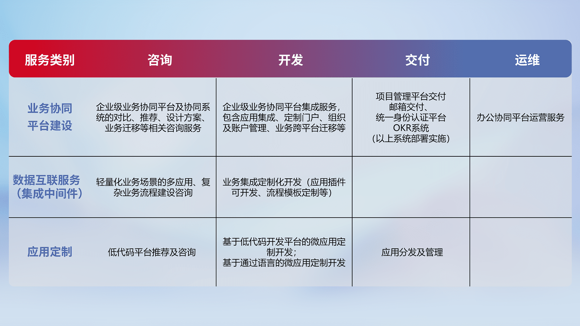 针对钉钉、、企微、、、IDaas等平台级产品提供产品的规划、、方案、、、交付、、定制化开发等服务,,,,实现如统一协同办公、、、智能客户服务、、混合会议管理、、、智能数据查询、、等业务场景,,,,实现数字化转型。。
